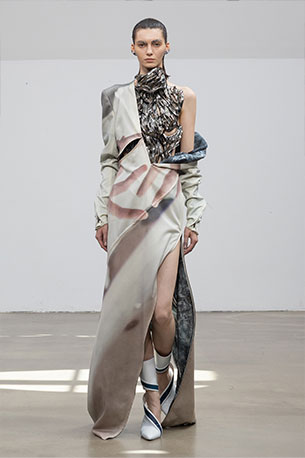The GLACIER collection comprises 26 looks - including dresses, trousers, jackets - each enhanced by digital textile printing to maximize color, texture, and drapery. Alongside silk organdy, prints appear on a wool blend of Brewed Protein™ fibers and cashmere, achieving a refined, silky touch.
