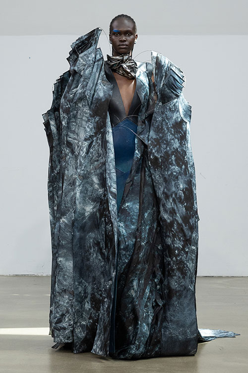 For this season’s collection, Mr. Nakazato traveled through Lapland in Finland, searching for the origins and true purpose of clothing. Inspired by the extreme conditions of the Arctic, the collection explores human vulnerability and the roles that garments play. Photographs taken by Mr. Nakazato of Lapland’s stark landscapes were reproduced on fabric using Epson’s digital textile printing technology, and footwear was crafted in part from non‑woven fabric sheets made with Dry Fiber Technology*1, that were recycled from used garments, yielding new forms and encapsulating surface effects that depict the aurora borealis.