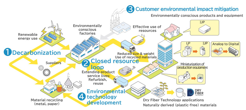 The Epson 25 Renewed corporate vision, which was established on March 18, 2021, includes Environmental Vision 2050. In line with this vision, Epson will pursue decarbonization and resource recycling programs, provide products and services that reduce environmental impacts, and develop environmental technology.