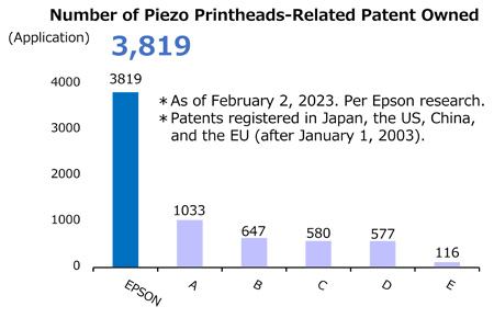 Piezo printheads are a core device in the printing sector. We own more patents related to these printheads than anyone else in the industry1, and this IP differentiates Epson from our competitors and is being actively developed or used in new inkjet printer products.
