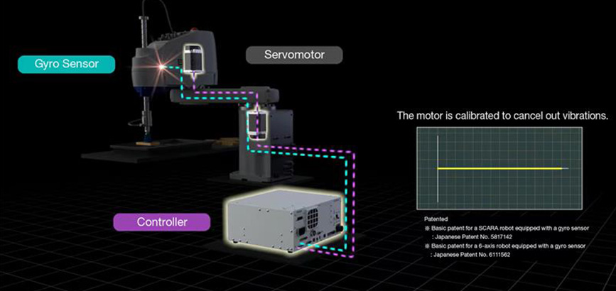 This control technology combines an ultra-compact gyroscopic sensor at the tip of the robot arm with advanced vibration control to sense and dampen minute vibrations even during high-speed robot movements and enable the arm to stop with exceptional accuracy and precision.