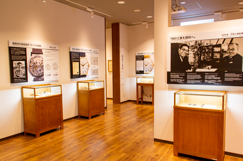 展示品にはコンクールへ出品した時計や、ロッカーほどの大きさであった水晶時計を持ち運べるサイズにまで小型化した「クリスタルクロノメーター」など、「創造と挑戦」の繰り返しによって誕生した画期的な製品が顔を揃えます。
