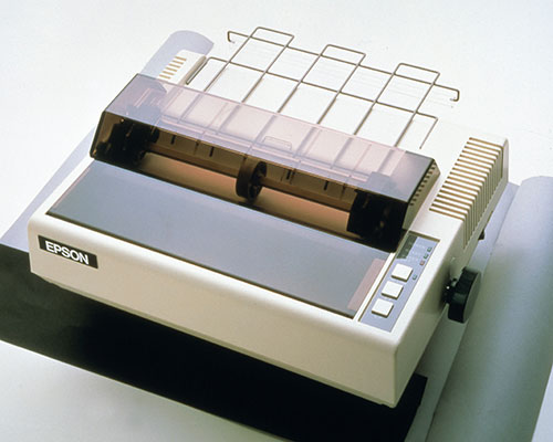 本格的なパーソナルコンピュータ用プリンタをめざして開発された「MP-80(海外市場ではMX-80)」。情報化が急速に進展するなか、業界に先駆けて小型・軽量化を実現したコンピュータ用プリンタとして、大変注目を集めました。ニードルと呼ばれる9本の細いワイヤがアクチュエータの電磁石の振動に呼応し動き、リボンを介して紙に衝突し印字される構造の「9ピンマイクロドットヘッド」を搭載。双方向最短印字方式を採用し、高精度なプリンティングを実現しました。また、9×9の文字構成と、40・66・80・132の各桁数指定が可能になり、機能的にも進化を遂げたプリンタでした。