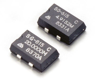 その結果誕生した「SG-615」は、プラスチック素材に熱硬化性のエポキシ樹脂を使用。表面実装のハンダ付け工程で使用されるリフロー炉の温度条件にも耐えられるよう、新たに開発した耐熱シリンダ型AT振動子を内蔵し、汎用SMDICと同等のハンダ付温度条件を実現しました。基本出力周波数範囲は、約1MHz〜26MHz。オーバートーン発振でさらに高次の周波数出力も可能でした。さらに、出力信号を止めたり出したりすることができるアウトプットイネーブル機能を備え、出力信号を変化させることができました。また、自社製CMOSICの強みを生かし、最大でも25mAという低消費電流を実現したのです。