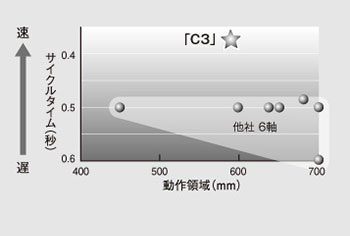 それまで、速度の遅い6軸は、速度の速いスカラと生産ラインで共存しにくいとされてきましたが、C3ではその常識を打ち破ることができたのです。