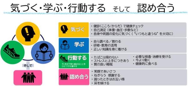そこで、健康Action2025の各施策に込めた想いを行動につなげるため、「気づく・学ぶ・行動する」というキーワードと合わせ、社員一人ひとりを尊重し、協力し「認め合う」を大切にする活動展開を意識できるスローガンとしました。