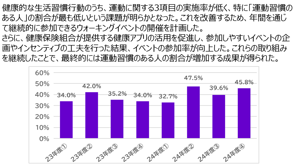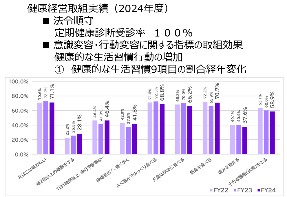 グループ傘下での健康推進活動の他、健康経営推進委員会、健康づくり推進委員会を中心に食事、運動、卒煙支援を始めとした健康推進活動を展開しています。
