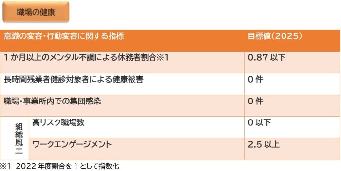 働きかたの多様化や社員の年齢構成の変化など、私たちの取り巻く環境が大きく変化することが想定されます。このような変化に向けて、社員一人ひとりが自身の健康状態を把握し、各自の状況に合った健康づくりに取り組んでいくことが重要と考えます。そこで、自律性の醸成・働くことと健康の調和を目指す「こころとからだの健康」と、安全配慮の徹底とチームでいきいきと働く組織風土の醸成を目指す「職場の健康*1」の2つを重点分野で取り組んでいます。なお、「健康Action2025」では、スローガン「気づく・学ぶ・行動する そして 認め合う」を掲げて活動を推進しています。