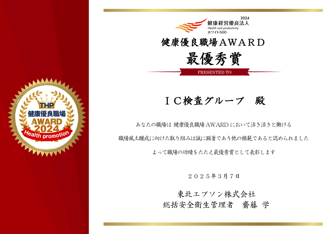 2025年3月、東北エプソンは「健康経営優良法人2025(大規模法人部門)」に3年連続認定されました。