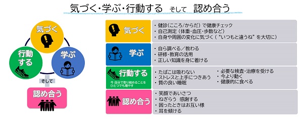 そこで、健康Action2025の各施策に込めた想いを行動につなげるため、「気づく・学ぶ・行動する」というキーワードと合わせ、社員一人ひとりを尊重し、協力し「認め合う」を大切にする活動展開を意識できるスローガンとしました。