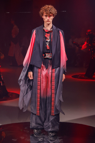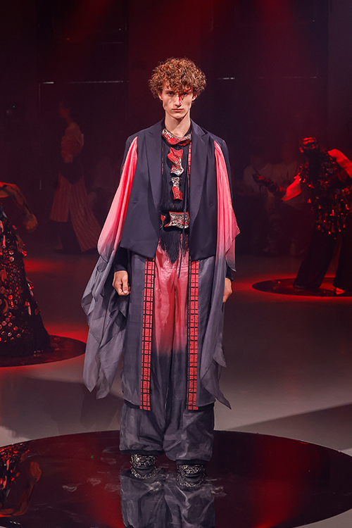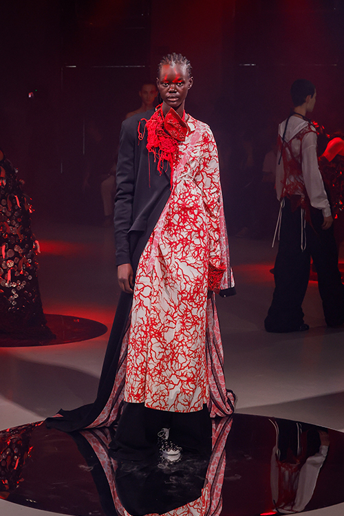 こちらの衣装は、約88mもある極薄のシルクオーガンジー生地に、中里氏がデザインした赤色と黒色のゆるやかなグラデーションをプリントしています。中里氏の繊細で大胆な発想から生まれる衣装デザインは、ショーのラストで観客を大きく魅了しました。