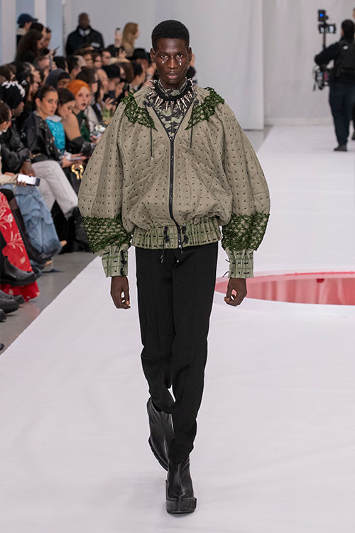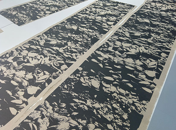 今回のコレクションでも不織布シートを作成し衣装に使用。これまでの黒ベースの混合素材に対し、本コレクションではコットン100%の単一素材で、素材を色分けし、カーキとベージュの不織布シートを作成。さらにその表面にはMonna Lisaの顔料インクでプリントを施しています。