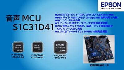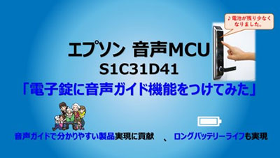 エプソンでは、住宅・家電・健康、産業用など、さまざまな分野の機器に搭載されている、音声ガイド機能を簡単に追加することができる音声再生マイコンを出展します。住宅において給湯器リモコンや家電製品などの音声を使った設備・機器が普及しているほか、健康機器のガイド、オフィスビルや商業施設、工場においても音声を使った警報機などの活用が進んでおり、これらの設備・機器に最適な音声再生専用ハードウエアを搭載した32ビットマイコン「S1C31D41」を展示します。