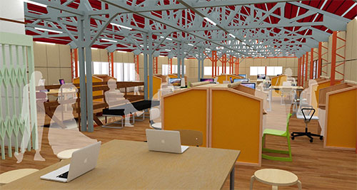 『ヒューマンハブ天寧寺倉庫』は、関美工堂が旧本社兼倉庫(1968年竣工・鉄骨造、敷地面積533坪、延床面積340坪)を改装し、1階は若手漆職人を支援する「スタートアップ/シェア工房」、2階は会津若松のスマートシティ変革に取り組むための「シェア/コワーキングオフィス」などを整備します。地域の伝統産業である漆器業とスマートシティとして先行するデジタル技術が融合し、モノづくりやコトづくりに関わる人々が、出会い、刺激し合う場(Human Hub)となることが期待されています。