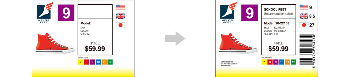 - 顧客は安価なブランクラベルの標準品を購入すればよく、割高な小ロットのカスタムプレプリントラベルを購入する必要がなくなる。