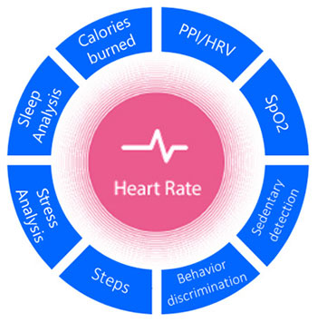 本SDKでは、脈波データを基に、各種生体情報(脈拍値、血中酸素飽和度、脈拍間隔計測、HRV*2計測)や、活動量情報(消費カロリー、睡眠分析、ストレス分析、歩数、行動判別、座りすぎ検知)の出力ができます。