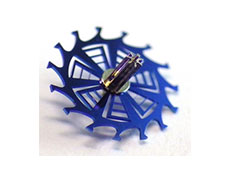 「シリコンがんぎ車」を、金属製の中心軸と軽量なシリコン材料からなる回転部材とで構成し、回転部材は、中心軸に対して回転ずれなくかつ偏心することなくはめ合わせできるように、シリコンのしなる特性を利用したバネ性を有する微細で複雑な形状に加工しました。この加工には、エプソンのプリントヘッドの製造にも使用される超微細加工技術を用いました。