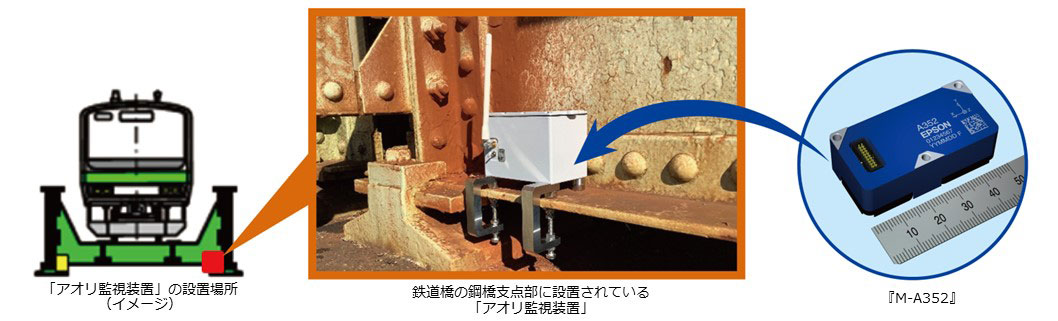 セイコーエプソン株式会社(以下 エプソン)は、自社製の高性能な3軸加速度センサー『M-A352』を搭載した、鉄道橋の鋼橋支点部の状態を遠隔で監視する「アオリ監視装置」を、東日本旅客鉄道株式会社(本社:東京都渋谷区、社長:喜㔟 陽一、以下 JR東日本)および、長野計器株式会社(本社:東京都大田区、社長:佐藤 正継、以下 長野計器)と共同開発、このたび実用化に成功したことをお知らせします。