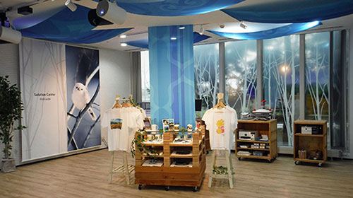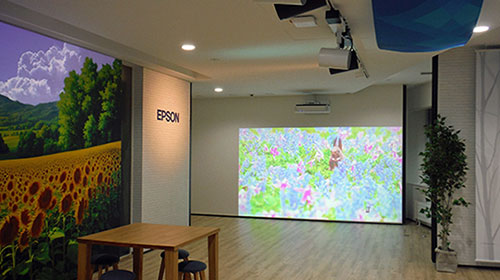 このたび、業務向けに導入を検討されているお客様に対して実際にこれらのソリューションを体験いただくため、当社のソフトウエア開発拠点内に新たにソリューションセンターを開設しました。内観は、北海道の自然や文化をモチーフとした装飾を施しており、エプソンのプリンターやプロジェクターを使った印刷と映像を組み合わせた演出を体感していただけます。