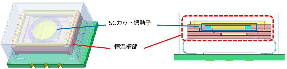 低消費電力の実現には、恒温槽の小型化が必要となります。そのための主要課題の一つは、恒温槽内部のSC(Stress Compensated)カット振動子の小型化です。
