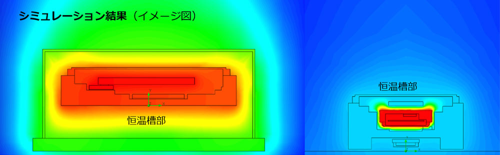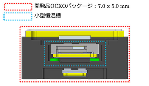 SCカット振動子の温度を低電力で一定に保つための動作に最適な、発振ICとヒーターICを独自開発し、それらを恒温槽に搭載。この恒温槽をOCXOパッケージの中に低熱伝導接着剤で接着して内部断熱性を高めることで、ヒーターICの発熱損失を抑制し低消費電力構造を実現しました。また、SCカット振動子の温度制御方式を従来のアナログ方式からデジタル方式に変更することで、周囲温度が変動しても内蔵のSCカット振動子の温度をより高安定に保つことに成功し、OCXOの周波数温度特性を±50 × 10-9*4から±3 × 10-9に低減しました。