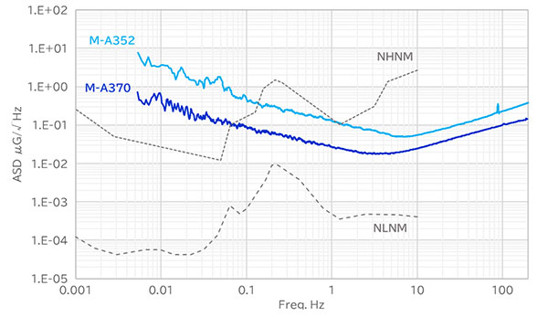 『M-A370AD10』は、エプソン独自の微細加工技術*1を用いた水晶加速度センサー素子とデジタルIP技術*2により、USGS-New High Noise Model*3を下回る低ノイズ性能を達成しました。また、高いバイアス安定性と広いダイナミックレンジを実現し、人体では感じることができない極微小地震計測や、常時微動を利用した地盤構造探査、建設物の長期的な傾き監視に優れています。