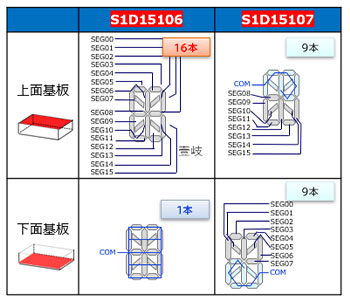 『S1D15107』はセグメント出力数の拡張により、本製品1チップでも多数の16SEG(セグメントディスプレイ)やアイコンなどの表示が可能です(図1、2)。また、多数のCOM端子をドライバICに配置することで、従来の多セグメント表示では難しかったパネルの上面基板と下面基板にSEG配線、COM配線を分散させ*1、ディスプレイ実装時の配線容易化に貢献します(図3)。さらに、セグメント/コモン出力異常(オープン/ショート)検出などの表示安全機能も備え、動作温度は最高105℃、AEC-Q100*2規格に対応しているため、信頼性の高い車載ディスプレイシステムの構築をサポートします。