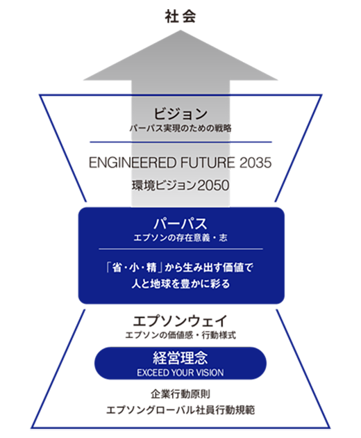 エプソンウェイは、エプソングループにおける共通の価値観・行動様式です。 エプソングループの根幹であり普遍的な考え方である「経営理念・EXCEED YOUR VISION」、経営理念に基づく価値観と行動の拠り所である「企業行動原則」、そして企業行動原則の読み解きである「エプソングローバル社員行動規範」。エプソンウェイはこれらの総称です。