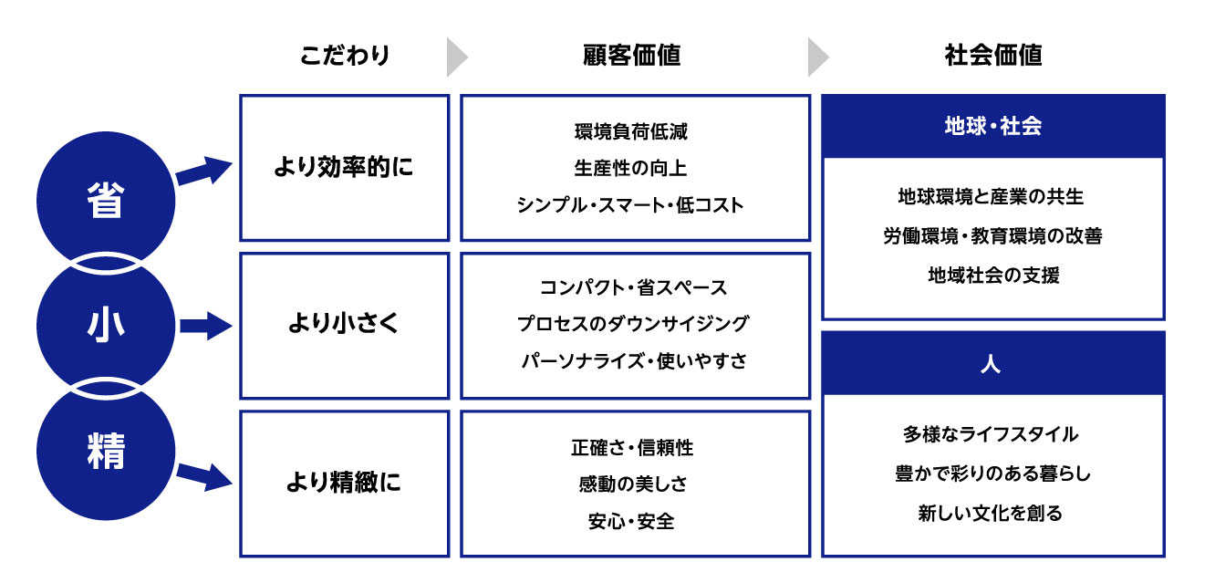 「省・小・精」にこだわった製品やサービスが、顧客価値として世界に拡がることで、社会価値を生み出します。