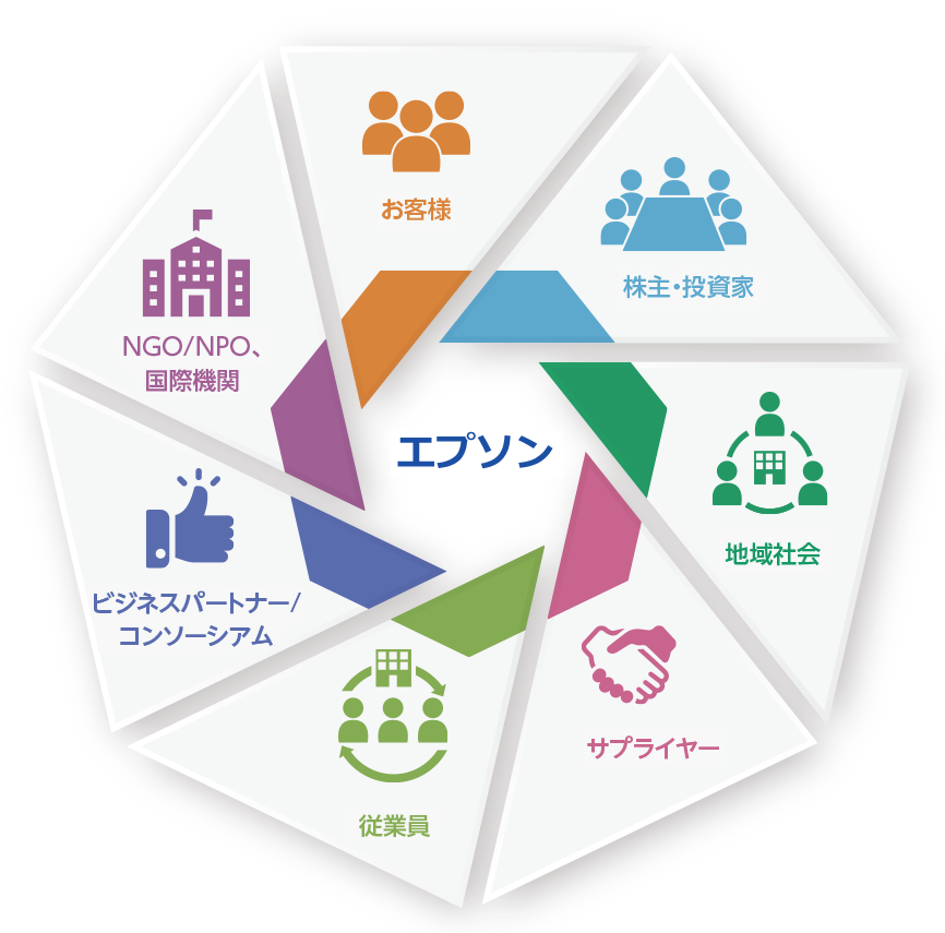 ステークホルダーエンゲージメント*1は、さまざまなステークホルダーの皆様とエプソンを結ぶ重要な架け橋です。エプソンは、全てのステークホルダーの皆様に以下の3つの価値を提供します。