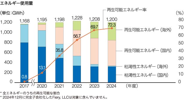 各拠点における省エネ活動の推進に加え、再生可能エネルギーの活用を進めています。2024年度は、従来1%に満たなかった再生可能エネルギーの比率を約72%(電力ベースでは100%)まで高めました。中期経営計画の実現のため、エネルギー使用量の増加が見込まれていますが、エプソンは今後も、生産革新を含めた削減施策を中心に、再エネ電力の活用と合わせた目標達成への取り組みを進めていきます。