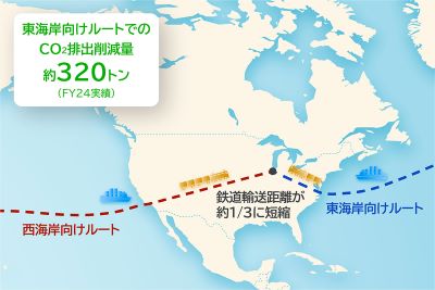 *1 東南アジアの生産拠点から米国の倉庫までの輸送において、コンテナ1本あたりの既存ルートと新ルートの排出量差に、2024年度に新ルートで輸送したコンテナ本数の実績を乗じて算出。コンテナあたりの温室効果ガス排出量は、「Emissions calculator of 2024」を使用。