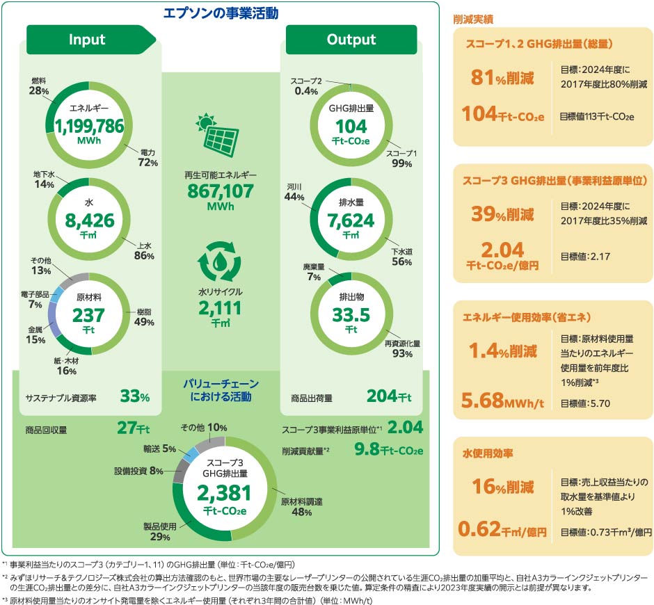 エプソンはさまざまな資源を投入して、商品・サービスのライフサイクルにわたる企業活動を行う過程で、温室効果ガス(GHG)をはじめとした排出物を大気・陸域・水域へ排出しています。