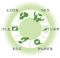 こうした考えのもと、製品設計(かんがえる)から原材料の調達(えらぶ)、製造(つくる)、輸送(とどける)、使用(つかう)、廃棄・リサイクル(いかす)に至るまで、製品のライフサイクル全体に着目して環境負荷を捉えるライフサイクル・シンキングの考え方を環境マネジメントに組み込み、お客様やビジネスパートナーの皆さまとともに、製品やサービスの環境負荷低減に取り組んでまいります。