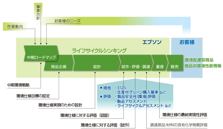 "モノが生まれてから、使命を終えるまで"のライフサイクル全体で商品が環境に与える影響は、商品の企画・設計段階でほぼ決定されます。エプソンは、ライフサイクルシンキングをベースに、2つの切り口((1)お客様のワークスタイルやライフスタイルを変える商品の提供でお客様のもとで発生する環境負荷を低減する、(2)商品の基本性能として有すべき環境性能を向上する)から、実現すべき環境仕様の具体的な目標を商品の企画段階で定め、その達成度を設計段階以降で評価する「環境配慮設計」の仕組みを取り入れています。