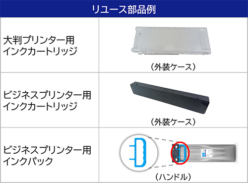 お客様が使い終わったインクカートリッジ・インクパックを回収し、リユース(再使用)部品の選別と、それらの部品を使った製造を行うことで、生まれ変わった商品を再度お客様へお届けします。