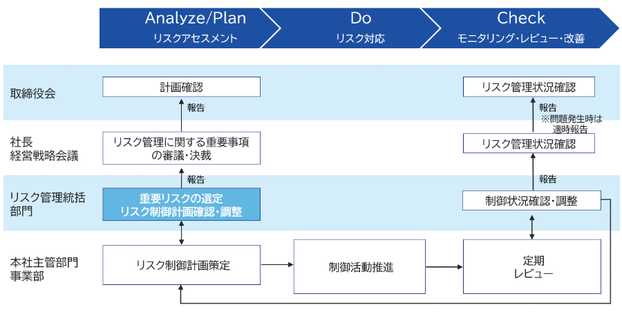 その特定した重要リスクに対し、制御計画の立案・実行と進捗状況のモニタリングを定期的に行っています。制御活動の有効性については、「全社重要リスク」は四半期ごとに、「事業重要リスク」「子会社重要リスク」は半期ごとに定期評価を実行していることに加え、常にリスク環境のモニタリングに努め、重大化しうる変化を認識した場合には、リスクを分析・評価し、必要に応じて重要リスクとして扱うよう制御計画を見直し、実効性の確保に努めています。また、社長はリスク管理に関する重要事項を四半期ごとに取締役会に報告しています。さらには、株主、顧客、従業員、取引先、地域社会、環境など、グループ内外の多様なステークホルダーに対して説明責任を果たすとともに、リスク管理の透明性と実効性の向上に継続的に取り組んでいます。