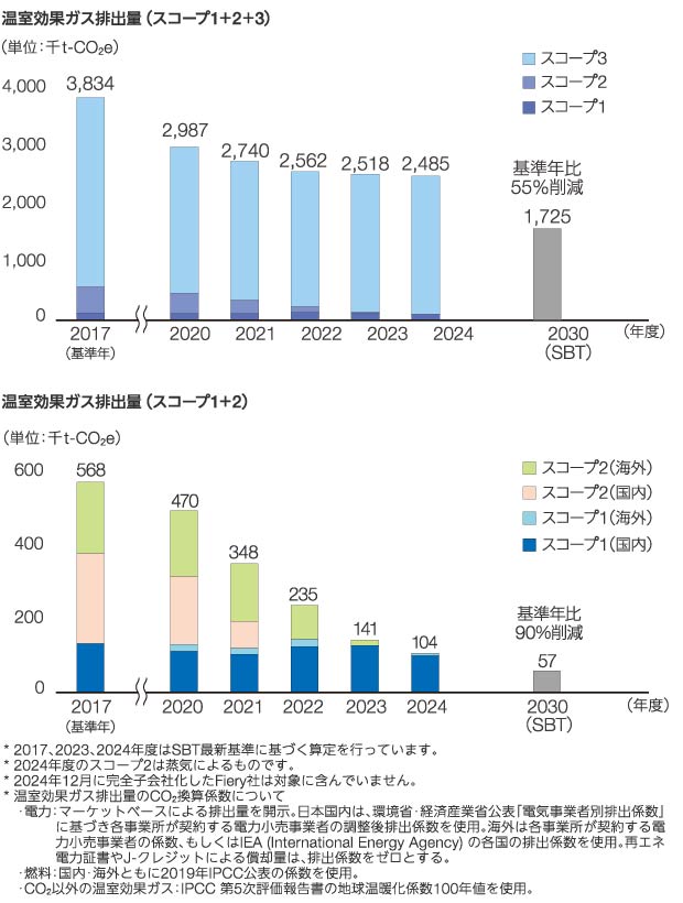 2018年のScience Based Targets(SBT)*1設定以降、1.5℃目標への引き上げを行い2025年度の目標達成に向けて活動を推進した結果、目標年を前倒して、グローバルに展開する全拠点におけるすべての使用電力を再生可能エネルギーへ置き換えました。また、このたびScience Based Targets initiative(SBTi)*2のNet-Zero基準に基づくNet-Zero目標およびその過程となる短期・長期目標が、SBTiから承認されました(2025年5月)。この目標は、既に環境ビジョン2050で掲げていた、2030年を目標年度とし全てのスコープを含む総量目標に対して、パリ協定における「1.5℃目標」を達成するための科学的な根拠に基づいた目標であることが裏付けられました。