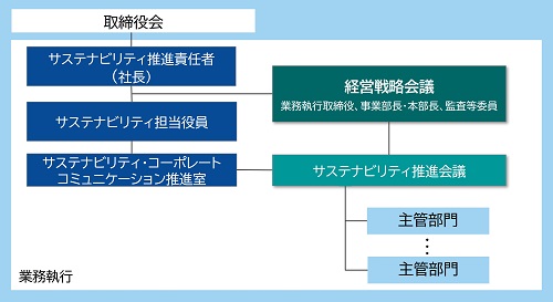 気候関連問題に対する最高責任と権限は代表取締役社長が有しています。サステナビリティ・コーポレートコミュニケーション推進室長にはサステナビリティ担当役員が任命され、TCFDを含むサステナビリティ活動の責任者として、これらの取り組みを管理・推進しています。気候変動問題への対応を含む全社環境戦略の立案・推進は、地球環境戦略推進室およびテーマ別環境部会が担っています。