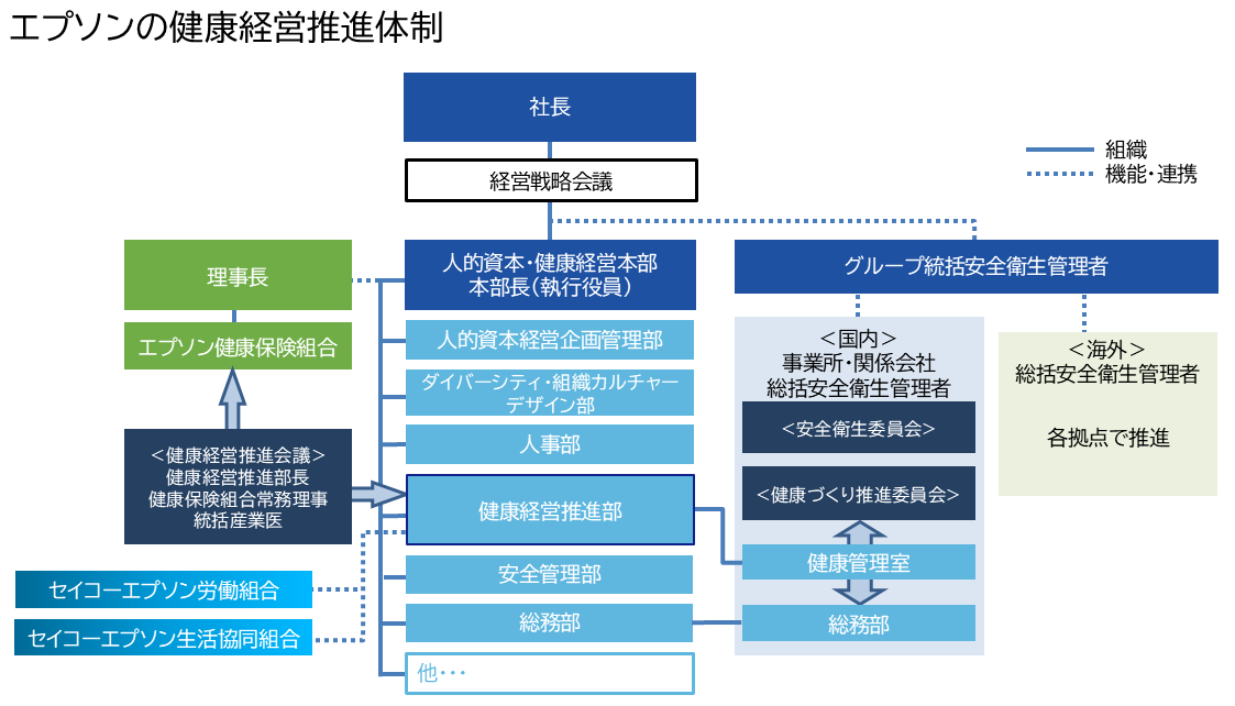 健康経営の責任者である社長の下、社会課題を解決する価値創出に向けて、エプソンならではの健康経営(Well-being経営)を推進していくための一体的な体制「人的資本・健康経営本部」を設置しています。その本部長は、執行役員として経営会議に参画するとともに、健康保険組合の理事長を兼任し、健康経営を総合的にマネジメントします。
