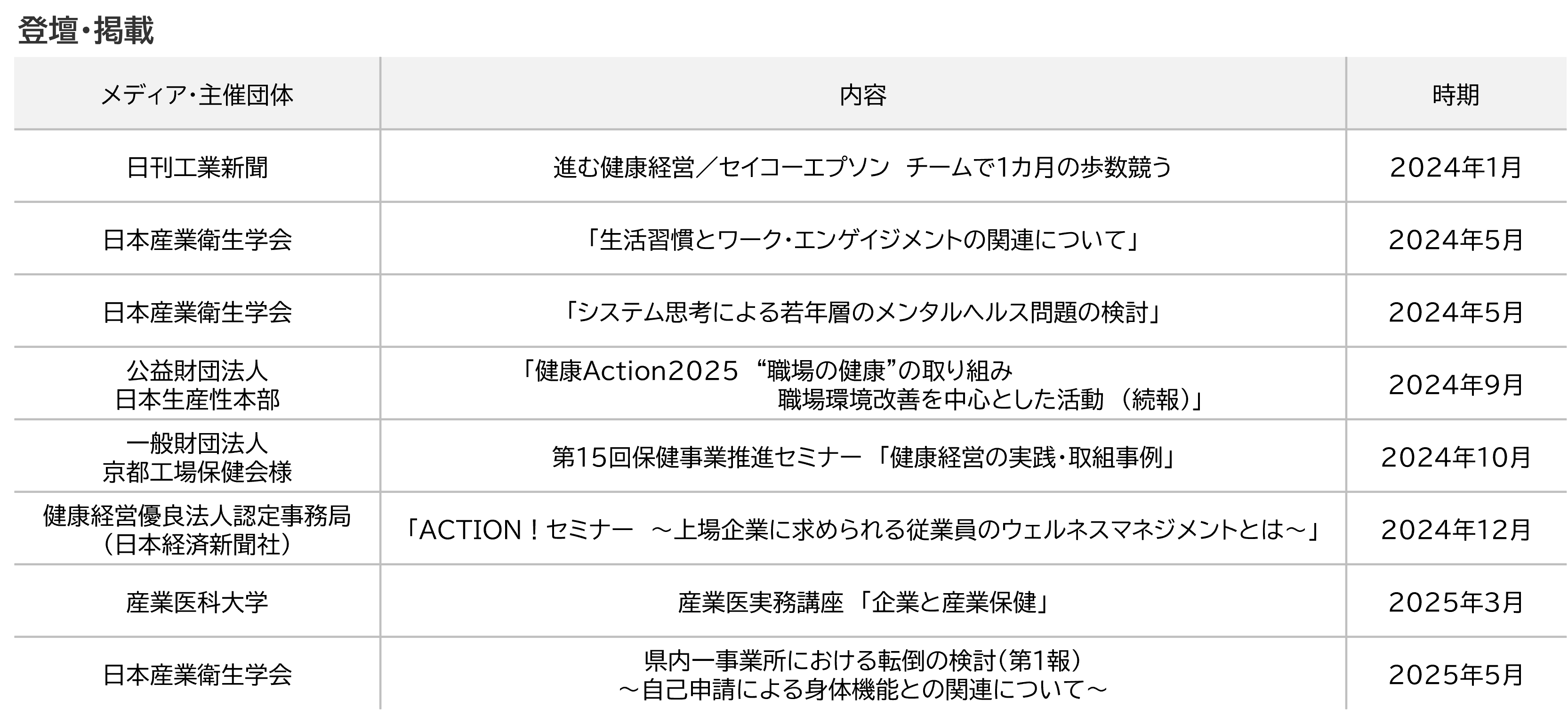 健康経営の普及活動の一環として、各社よりご依頼いただいたアンケートへの回答や健康関連情報誌への寄稿、および「エプソンの健康経営」の取り組みに関する情報提供、講演を行っています。