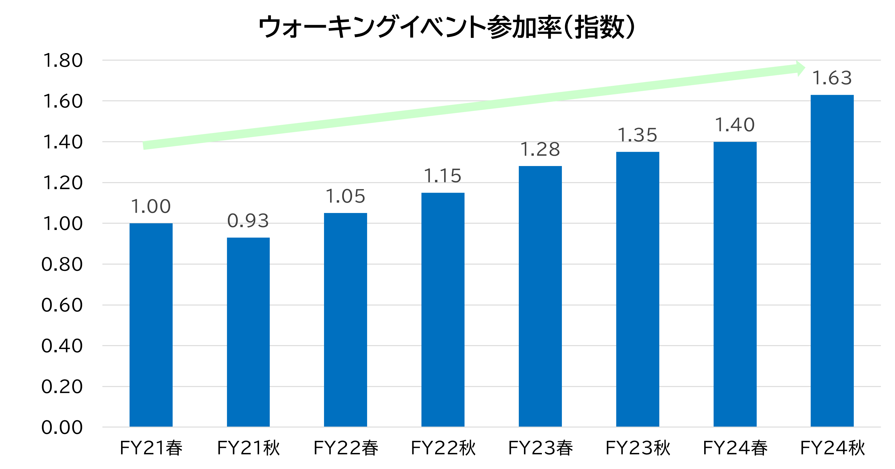 2021年度からは健康保険組合との共催により、ウォーキングイベントを春と秋の年2回開催しており、年々参加者が増加しています。