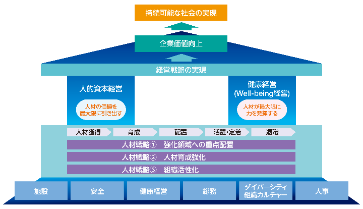 社員の自律性と環境変化への対応力を高めるとともに、社員の意欲やエンゲージメントを向上させ、価値を生み出す人材の活躍推進と、失敗を恐れず前向きに挑戦し続ける組織カルチャーを醸成します。それにより、人材の価値を最大限に引き出し 中長期的な企業価値向上に資することを目指して、人的資本経営と健康経営を軸とした人材戦略を展開しています。