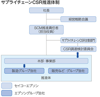 セイコーエプソンサプライチェーンマネジメント(SCM)担当役員は、SCM推進責任者として、サプライチェーンにおけるCSR推進をグループ全体で連携し活動しています。