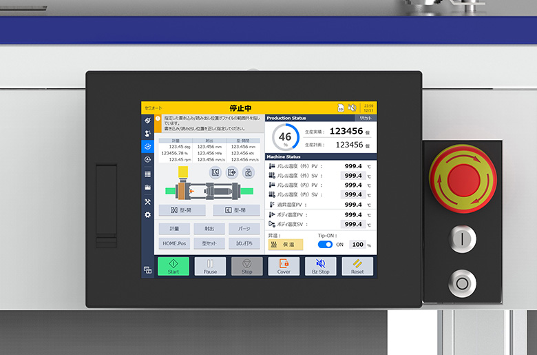 成形条件を緻密にコントロールするための操作パネルは、操作ミスを防ぐこと、迷わせないことを意識しながら、ユーザーの知りたい情報を明確に見せることを重視しています。機能のゾーニングにより、瞬時に成形状況が把握できるようにしました。作業者は、金型と操作パネルを交互に見ながら、射出速度、圧力、マイクロプローブ温度などの条件設定とモニタリングが可能になります。