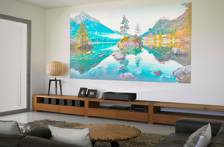 EB-LS800シリーズは最大150インチの大画面映像、ヤマハ製の2.1ch高音質スピーカー、動画コンテンツ視聴機能(Android TV™)が一体となった超短焦点プロジェクターです。