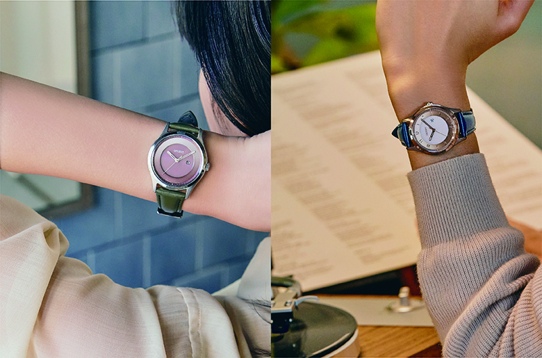 3針タイプは36mm、クロノグラフタイプは38mmの計6色です。日々のコーディネートや、どの時計を選んでも似合うベーシックなレザーバンドを9色用意しました。選ぶ時も着ける時も楽しい気持ちで手に取っていただけたら嬉しいです。