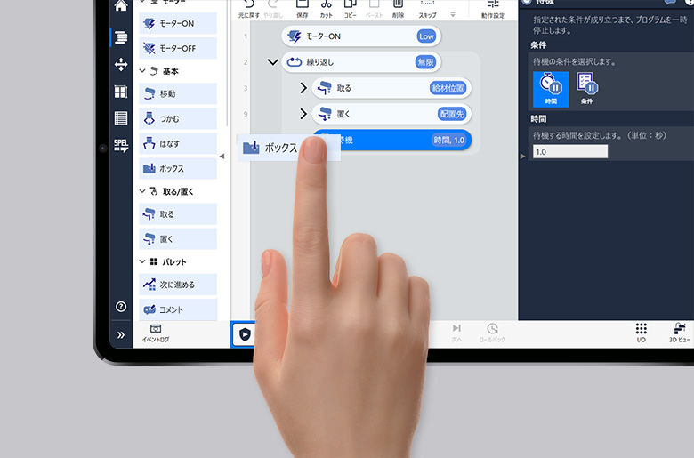 ユーザーがプログラムを作成するうえで必要最低限の機能をワークフローから絞り込みシンプル化を図るとともに、ドラッグ&ドロップでコマンドを並べるだけでプログラムが完成するビジュアルプログラミング環境を採用。また、コマンド表記を自国の日常的な言葉で表すなど、難しいプログラム言語を覚える手間を無くしました。