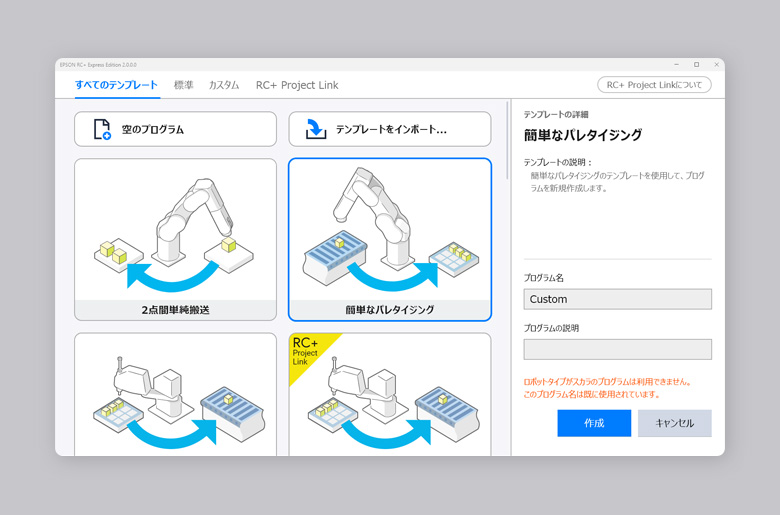 プログラム作成作業を容易にするため、テンプレート機能を搭載。やりたいことを選ぶだけで素早くプログラムのスケルトン(骨組み)が自動生成されます。