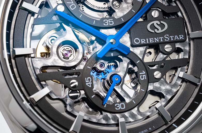 文字板のパーツ類は立体的な直線基調の造形とグレートーンの色調でまとめ内部の機械を見ることができるスケルトン構造の表現と相まって奥行感を感じる重層的なディテールでありながら時計としての判読性を確保しています。3面カットと仕上げ分けを施したブルーの針はエプソン自社開発のシリコン製がんぎ車の鮮やかなブルーの色調とのコンビネーションでアクセントを加えています。